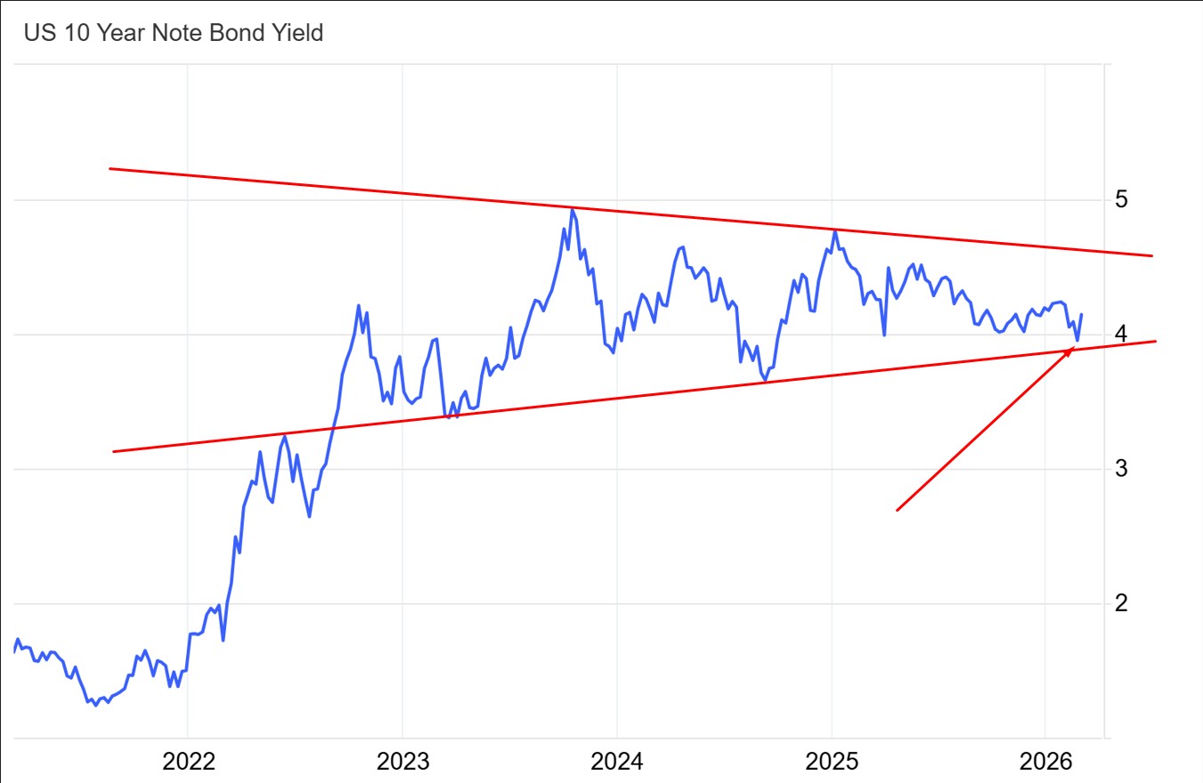Oil spiked well over 20% this week, and interest rates on U.S. debt rebounded right back into the wedge you can see above. What’s remarkable about the move is actually how unremarkable it is, considering the general global situation today.